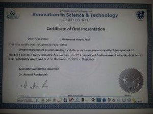 نوروزی فرد با عنوان مقاله مدیریت اثر بخش از طریق شناخت چالشها و ظرفیت های منابع انسانی سازمان توانست در دومین کنفرانس بین المللی علوم فناوری و تکنولوژی حضور پیدا کند ،نواوری درمدیریت منابع انسانی,بعنوان ابزار کلیدی برای ظرفیت سازی و ارتقاء ان در عصر جهانی سازی است یعنی آنچه که برای توسعه ی مدیریت دولتی مطلوب ضروری است,نیازی جدی برای نوآوری در مدیریت منابع انسانی است که به عنوان ظرفیت سازی برای مواجهه با چالشهای جهانی شدن عمل میکنند.