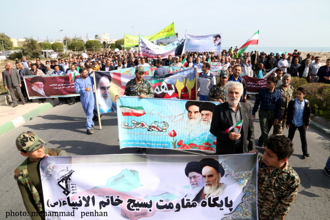 مردم جزیره خارگ با در دست داشتن پرچم های جمهوری اسلامی ایران و با سردادن شعارهای «مرگ بر آمریکا»،«مرگ بر اسرائیل»، «الله اکبر» نفرت و انزجار خود را از استکبار جهانی و ایادی آن فریاد زدند و بر استمرار راه شهدا در استکبارستیزی و دفاع از آرمان های انقلاب تأکید کردند.