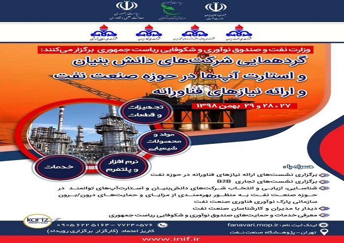 به گزارش پایگاه اطلاع رسانی شرکت پایانه های نفتی ایران ، گردهمایی شرکتهای دانش بنیان و استارتآپهای در حوزه صنعت نفت و ارائه نیازهای فناورانه در تاریخ ۲۷ تا ۲۹ بهمنماه در پژوهشگاه صنعت نفت برگزار میشود.