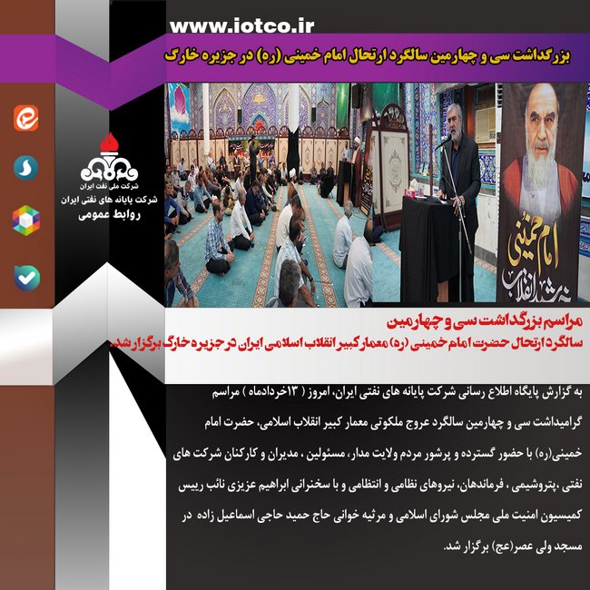 به گزارش پایگاه اطلاع رسانی شرکت پایانه های نفتی ایران، امروز ( 13خردادماه ) مراسم گرامیداشت سی و چهارمین سالگردعروج ملکوتی معمار کبیر انقلاب اسلامی، حضرت امام خمینی(ره) با حضور گسترده و پرشور مردم ولایت مدار و مسئولین، مدیران و کارکنان شرکت های نفتی، پتروشیمی، فرماندهان، نیروهای نظامی و انتظامی و با سخنرانی ابراهیم عزیزی نائب رییس کمیسیون امنیت ملی مجلس شورای اسلامی و مرثیه خوانی حاج حمید حاجی اسماعیل زاده در مسجد ولی عصر(عج) برگزار شد.