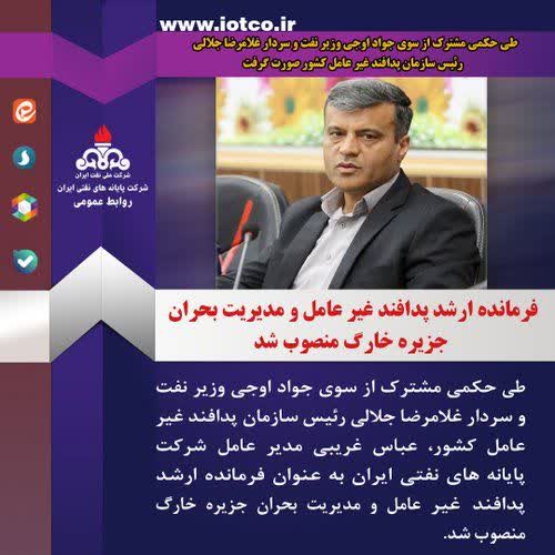 طی حکمی مشترک از سوی رییس سازمان پدافند غیرعامل کشور و وزیر نفت، عباس غریبی مدیرعامل شرکت پایانه های نفتی ایران به عنوان فرمانده ارشد پدافند غیر عامل و مدیریت بحران جزیره خارگ منصوب شد