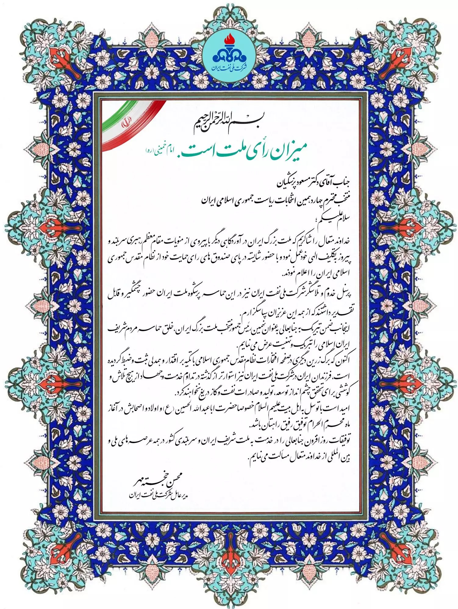به گزارش پایگاه اطلاع رسانی شرکت پایانه های نفتی ایران به نقل از پایگاه اطلاع رسانی شرکت ملی نفت ایران، متن پیام محسن خجسته مهر بدین شرح می باشد.
