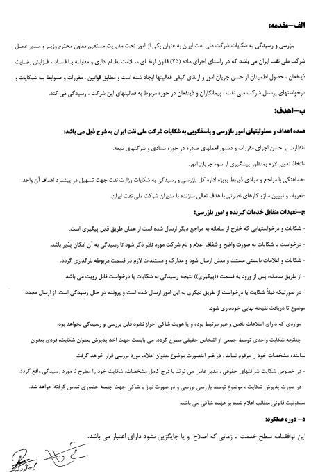 بازرسی، ارزیابی عملکرد و رسیدگی به شکایات نظارت بر حسن اجرای دستورالعملها، مقررات، مصوبات و نظرات مدیریت و انطباق آنها با عملکردها و نحوه اجرای آنها و تهیه گزارشهای لازم هماهنگی و پیگیری در جهت پیشبرد و ارتقا سلامت اداری از طریق اصلاح مقررات و ظوابط با بهرهگیری از امکانات فرهنگی و بکارگیری نظام موثر پیشگیری و برخورد با تخلفات بررسی قراردادهای داخلی و خارجی به منظور انطباق با قوانین موضوعه و رعایت صرفه و صلاح و حفظ منافع شرکت سرکشی و مراجعه به واحد های سازمانی و مناطق جهت مذاکره و گفتگو با مسئولین و کارکنان به جهت رسیدگی به مشکلات و موضوعات مطروحه در ابعاد (فنی/ مالی/ تدارکاتی/ پیمانها و ....) و تهیه و ارائه گزارشهای لازم بر اساس نتایج تجزیه و تحلیلهای کارشناسی نظارت و بررسی در فرآیند برگزاری مناقصهها و مزایدهها ارزیابی، بررسی، تحقیق و بازرسیهای ویژه بخصوص در رابطه با مسائل مالی، قراردادی، اداری و تدارکاتی که بنا به درخواست مدیریت شرکت در رابطه با انحراف از ضوابط و مصوبات ارجاع میگردد. بازرسی از تاسیسات، ساختمانها، در ستاد، مناطق و فعالیتها و اقدامات جاری در آنها به جهت حصول اطمینان از اجرای ضوابط و مقررات در حفظ و نگهداری امکانات و تجهیزات و مراقبتهای درونسازمانی بررسی مسائل و مشکلات فی مابین شرکت با مسئولین محلی محل فعالیتهای شرکت و انعکاس نتایج حاصله به مراجع ذیربط بررسی و رسیدگی به موارد ارجاعی از سوی سازمان بازرسی کل کشور و تهیه گزارش لازم پس از مشاوره و کسب نظر مدیرعامل توافقنامه سطح خدمت دریافت شناسه خدمت شرکت در نظرسنجی برخط